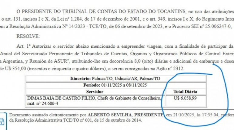 De 1º de setembro de 2024 a 1º de setembro de 2025 os sete conselheiros do TCE colocaram nos bolsos cerca de R$ 1 milhão de diárias (R$ 983,1 mil). Mais de 90% para fora do Estado e do país.