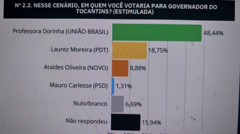 Dorinha aparece na estimulada com os candidatos já colocados (Dorinha, Laurez, Ataídes e Carlesse) com 48,44% contra 18,75% dos votos.