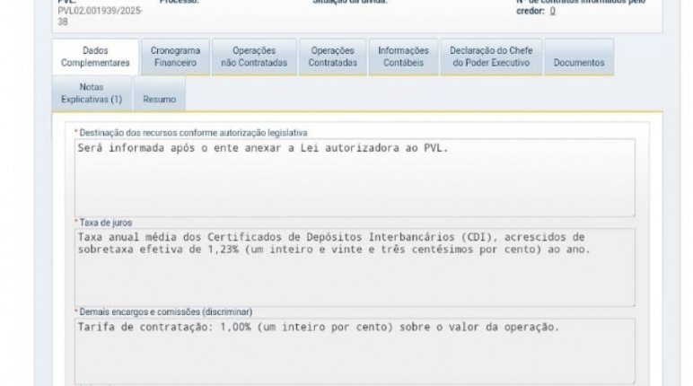 Já está protocolado no Sistema de Análise de Dívida Pública da Secretaria do Tesouro Nacional o pedido de empréstimo de R$ 1,7 bilhões que o governo quer contratar com o Banco do Brasil.
