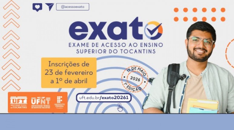 As inscrições para o Exame de Acesso ao Ensino Superior do Tocantins (Exato) 2026 (1ª edição) estão abertas até 1º de abril. Atualmente, essa é a forma de ingresso nos cursos superiores do Instituto Federal do Tocantins (IFTO). Isso significa que o candidato precisa realizar o Exato para, posteriormente, disputar uma vaga utilizando a pontuação obtida no exame.