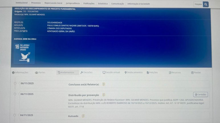 Foi concluso na tarde desta quinta ao ministro Gilmar Mendes (STF) a ADPF protocolada pelo Solidariedade em favor da suspensão do afastamento de Wanderlei Barbosa.