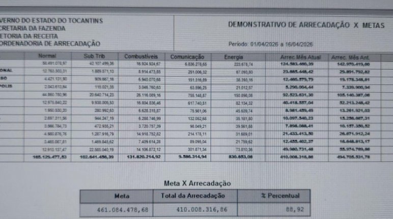 A meta de ICMS do mês de abril é de R$ 461 milhões. Arrecadou até quinta R$ 410 milhões. Esta meta aí de R$ 461 milhões é 12,3% menor do que a arrecadação de ICMS de abril de 2025, da ordem de R$ 517 milhões. Somada a inflação, uma previsão de perda nominal estimada em 17,2%.