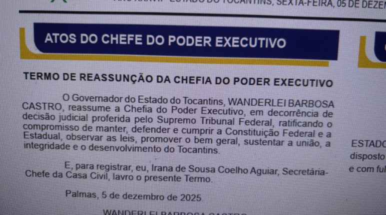 A secretária da Casa Civil, Irana Coelho, fez publicar no Diário Oficial de ontem a noite a volta de Wanderlei Barbosa ao cargo de governador do Estado, cumprindo a ordem do STF. "ratificando o compromisso de manter, defender e cumprir a Constituição Federal e a Estadual, observar as leis, promover o bem geral, sustentar a união, a integridade e o desenvolvimento do Tocantins." O termo de assunção é, como não poderia deixar de sê-lo, a primeira publicação do DO. Ou seja: Wanderlei já pode renomear ou nomear secretários.
