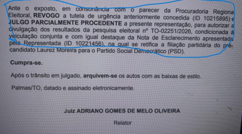 A pesquisa foi divulgada em primeira mão no dia 1º de fevereiro por este blog. O juiz eleitoral determinou tão somente que a empresa faça o esclarecimento sobre o partido de Laurez Moreira: PSD e não PDT.