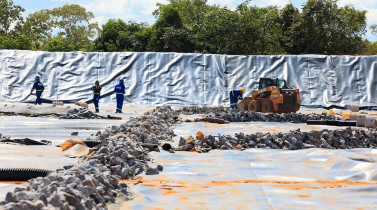 Iniciados em outubro de 2025, os trabalhos avançaram na instalação da manta impermeabilizante de polietileno de alta densidade (Pead) de dois milímetros, estrutura fundamental para impedir a infiltração de líquidos no solo e evitar contaminações ambientais. Ao todo, estão sendo aplicados cerca de 67 mil metros quadrados de manta para cobertura da nova área de depósito.