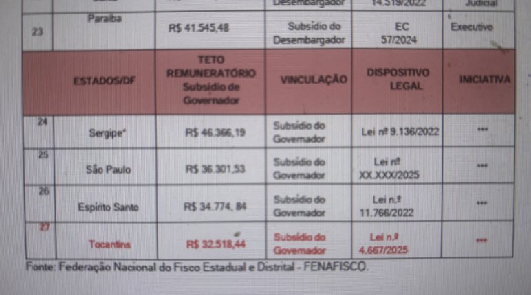 Mas atenção: o Tocantins é o menor subteto do país (Fenafisco/mai/25).