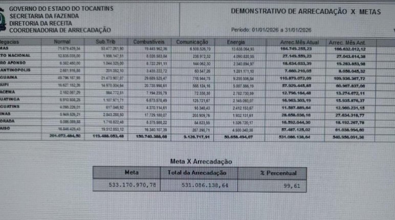 A Fazenda arrecadou em janeiro a soma de R$ 531 milhões e 86 mil. Abaixo da arrecadação prevista para o mês projetada para R$ 533 milhões e 170 mil.