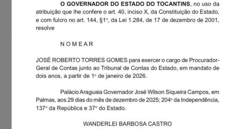Publicou ontem a nomeação do procurador de Contas, José Roberto Torres Gomes, como procurador geral de Contas do TCE. Ato 3641, de 29 de dezembro de 2025.