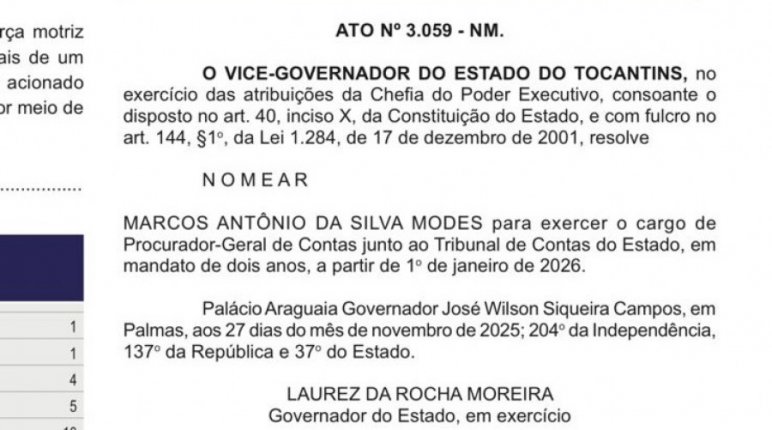 Ocorre que o ex-governador interino, Laurez Moreira, exercendo sua competência constitucional, havia nomeado para o cargo o procurador Marco Antônio da Silva Modes. Ato 3059, de 27 de novembro de 2025.